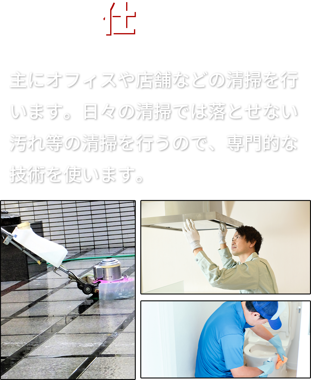- 店舗やオフィス、ビルなどの清掃業務を行います。